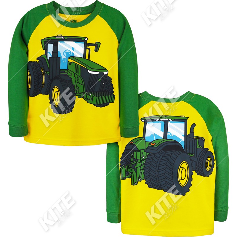 Orangefarbenes T-Shirt für Kinder mit plakativem Traktor auf der Vorderseite. Material: 100% Baumwolle.