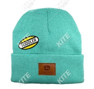 Grüne Strickmütze für Kinder mit Kunstlederpatch. Material: 100% Acrylfaser.
