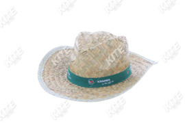 Klassischer hellbrauner Strohhut für Damen und Herren. Mit leicht konkaver Krempe und grünem Kramer-Werbehutband.
